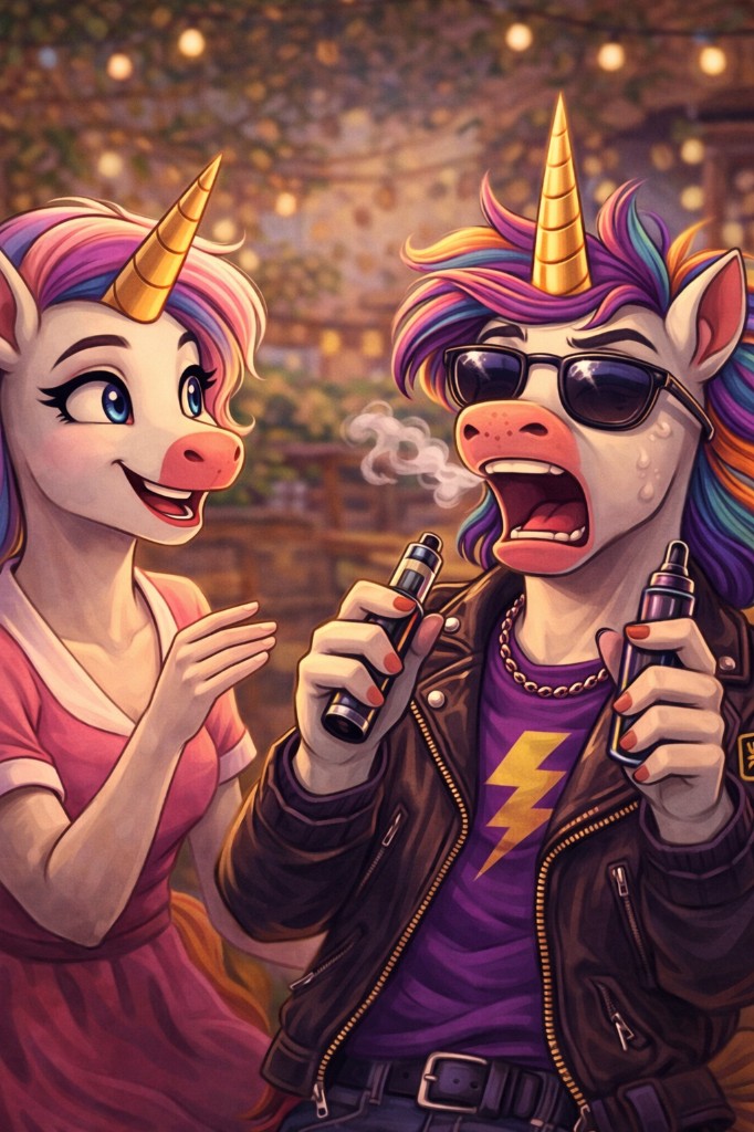 Two unicorn friends on a couch, one showing the LaterVape app on their phone